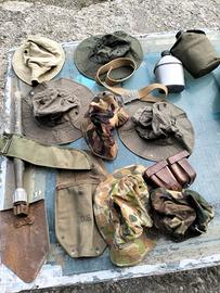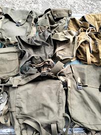 Vari zaini borse tracolle militari americane e non vari cappelli borracce gavette mimetica solo il sopra con cappuccio mantella impermeabile con cappuccio tutta aperta