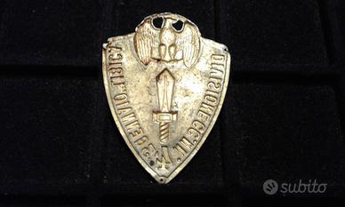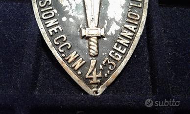 Bellissimo scudetto da braccio della 4^ Divisione delle Camicie Nere (CC.NN.) 3 Gennaio Libica. I primi reparti della Milizia Coloniale sono presenti a partire dal 1923 sulle sabbie del deserto dell'Africa Settentrionale e si uniscono ai reparti metropolitani per partecipare alle operazioni antiguerriglia contro le tribù ribelli. Lo scudetto da braccio viene istituito soltanto nel 1939 per le Camicie Nere delle 4 Divisioni autonome permanenti stanziate in Libia. Unico disegno uguale per tutti; gladio romano in palo e aquila della Milizia, in versione metallica (alluminio)dorata e con fondo verniciato in nero. Uniche varianti il numero progressivo e la rispettiva denominazione dedicata alle date storiche del fascismo, in questo caso il 3 Gennaio. La 3 Gennaio era di stanza a Derna. La 4ª Divisione CC.NN. "3 gennaio" era una divisione italiana della Milizia Volontaria per la Sicurezza Nazionale (MVSN), che fu impiegata nella Guerra d'Etiopia e poi nella Campagna del Nordafrica durante la seconda guerra mondiale. Venne distrutta nel gennaio 1941 nell'ambito dell'Operazione Compass. Il nome "3 gennaio" le venne dato in quanto il 3 gennaio 1925 Mussolini tenne alla camera il discorso col quale viene, generalmente, fatto coincidere l'inizio del regime. Lo scudetto è in buone condizioni, piccole parti della vernice nera sono venute meno segno che il distintivo è stato effettivamente indossato in operazioni di guerra, le sue dimensioni sono 63mm x 53mm circa. La "pregevole" e "notevole" fattura di questo scudetto, lo pongono quale cimelio "importante" ed "imperdibile" da collezionare, per gli amanti del materiale del "VENTENNIO". Spedizione: Raccomandata (7 euro); Metodi di Pagamento: Bonifico Bancario. Vaglia Postale, Paypal, altri sistemi postali. Diritto di recesso 10 giorni. Si vende con mia dichiarazione di autenticità acclusa.