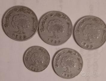 Tre monete da 5 millimes, Tunisia 1960. Una moneta da 2 millimes, Tunisia 1960. Una moneta da 1 millimes Tunisia 1960.