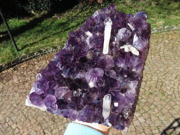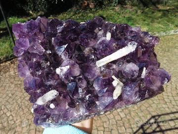 Straordinaria e unica drusa di ametista dal colore intenso con associati cristalli di calcite