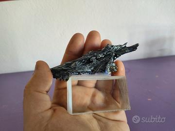 2. Stibnite naturale – Cristalli metallici allungati dall’aspetto futuristico. Minerale raro e affascinante, ideale per collezionisti.