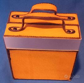 Mini bar da viaggio - vintage - Valigetta da viaggio mini bar in pelle e metallo, colore marrone chiaro, 2 manici. Dimensioni chiusa: 12,5 cm. larghezza, 14 cm. altezza e 7 cm. profondita'. 24 cm. larghezza aperta. 2 bicchierini in vetro e 4 bottigliette