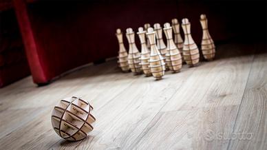 Set di birilli e palla da bowling in legno, perfetto per un gioco da tavolo. - Materiale: legno - Design a incastro Assembled ball size: 100 mm. Assembled pin size: 175*53 mm. Number of details: 131. Assembling without glue.