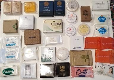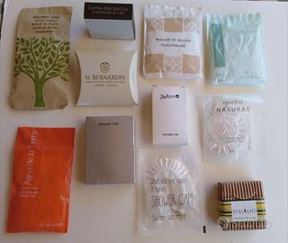 Mini collezione prodotti cortesia hotel. Oltre 80pz tra gel doccia/shampoo, lozione corpo, saponi, cuffie da doccia.