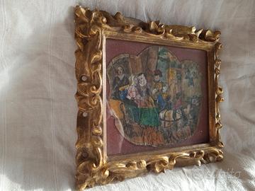 Raro dipinto antico su pergamena, raffigurante coppia di amanti in una carrozza trainata in luna park.