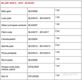 Vendo kit 12 ricambi originali Blade per elicottero mSR X a 60 euro. Sono tutti nuovi in confezioni ancora sigillate (vedi tabella in foto). Il valore complessivo (prezzi di 5 anni fa) è di circa 65 euro. Aggiungo sul prezzo l'elicottero mSR X - BNF con una batteria da 150 mhA: è USATO ma ha tutto l'hardware in ottimo stato e monta numerosi upgrade RakonHeli originali. Non vola da anni e l’elettronica è da testare. NOTA BENE: trattandosi di un modello BNF (bind and flight) il radiocomando non è incluso, funziona con radio Spektrum (esempio DX6i). Invio manuale in italiano in pdf.