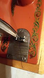 Modellino funzionante di macchina da cucire fine anni ' metallico con chiavetta, funzionante e com60 "Orsha", in metallo con base in legno, decorazioni in oro, verde e rosso, cassetto portaoggetti chiuso da coperchiopletata dalla suo custodia originale, entrambi molto ben mantenute.
