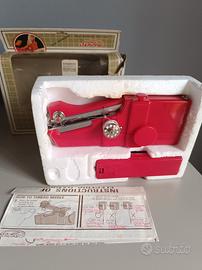 Vendo mini macchina da cucire portatile SenFon, un iconico gadget vintage perfetto per piccoli lavori di cucito rapidi (orli, tende, riparazioni d'emergenza). Funziona a batteria ed è progettata per essere usata con una sola mano, come se fosse una cucitrice. Caratteristiche del prodotto: Marca: SenFon. Modello: Electric Handy. Condizioni: L'oggetto è nuovo e mai usato, completo di scatola originale, polistirolo protettivo e manuale d'istruzioni (con note in italiano scritte a mano, come da foto). Alimentazione: Funziona con batterie stilo (non incluse). Accessori: Include la bobina di filo già montata. Ideale per collezionisti di modernariato, amanti del vintage o come pezzo da esposizione. La scatola presenta alcuni segni del tempo che ne testimoniano l'originalità, ma il contenuto è perfettamente conservato. Per ulteriori foto e informazioni non esitate a contattarmi