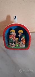 Mini presepe in ceramica colorata con figure della Sacra Famiglia in rilievo inserite in tazzina . Misure 8x6 cm.
