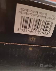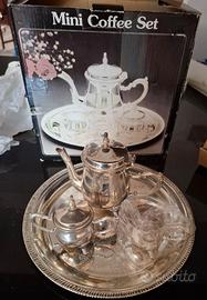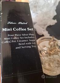 Bellissimo set da caffè mini in argento placato Silver Plate , perfetto per un tocco di eleganza. set da caffe o tè composto da 4 pezzi: zuccheriera con coperchio, lattiera 7cm, caffettiera alt.24 cm vassoio 32cm. Tutto in simil argento placcato In silver plate (scrivo simil in quanto come si vede dalle foto, sulla confezione c'è scritto placcato argento ma sui pezzi non vi è marchio e nella confezione non ci sono certificazioni).Sono stati tolti dalla confezione solo per fare le foto e come si vede, . Include teiera, zuccheriera e lattiera. Piatto da portata incluso.- In ottime condizioni ben conservato nuovo mai usati.
