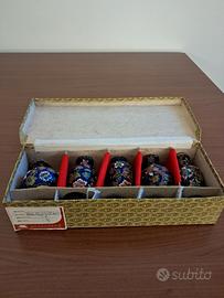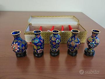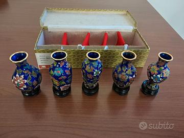 Set di 5 mini vasi cinesi vintage realizzati con la tecnica del cloisonne' completi di scatola originale e supporto in legno. Altezza compreso supporto 9cm.