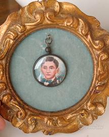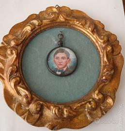 Piccola e deliziosa miniatura con ritratto di bambino di fine XIX secolo, dipinto a tempera su pergamena. Il ritratto è contenuto in un medaglione con vetro curvato , inserito in un’ottima cornice circolare in legno scolpito e foglia d’oro, con passpartout in velluto di seta color salvia. Diametro: 9 cm Un oggetto da collezionisti molto ben conservato.