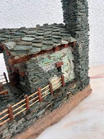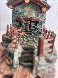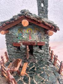Miniatura artigianale di chiesa di montagna, realizzata a mano con pietre naturali e dettagli in legno. L’edificio presenta tetto in lose, piccolo sagrato recintato e campanile in pietra con croce metallica. Base effetto tronco d’albero. Altezza circa 30 cm. Pezzo unico, dallo stile rustico e tradizionale, ideale per collezionisti o arredamento.