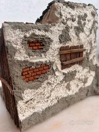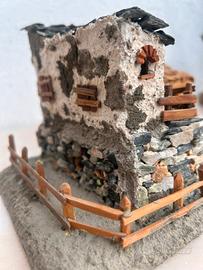 Miniatura artigianale raffigurante una piccola costruzione rurale, tipo stalla o casetta di montagna, realizzata a mano con pietra e dettagli in legno. La struttura presenta porte frontali, tetto in lastre di pietra e finiture rustiche che richiamano l’architettura tradizionale alpina. Ideale come oggetto da collezione o decorazione