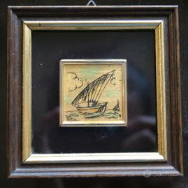 L'opera raffigura una raffinata marina con barca a vela, eseguita con lavorazione artigianale.