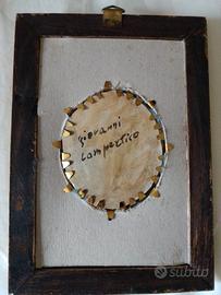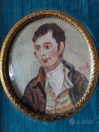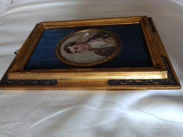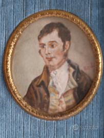 Raffinatissima miniatura raffigurante un giovane aristocratico in vesti neoclassiche. La miniatura, di forma ovale, probabilmente una tempera su cartone, è completa di sua cornice in legno dorato e decorazione, con ghiera in metallo inciso e vetro bombato. Sul retro è riportato, probabilmente, il nome dell’uomo ritratto. L’incisione riporta una sigla del pittore. Il passpartout è ricoperto di velluto di seta celeste. L’opera è in ottimo stato di conservazione, come da foto, e rappresenta uno splendido oggetto da regalo o da collezionismo. Misura totale: 16 x 12 cm Le foto rappresentano il bene così come venduto.