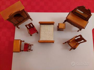 Miniatura camera da letto per casa delle bambole in legno della prima metà del 900. Fornita di: 1 armadio con cassetti apribili, 1 mobile con specchio e cassetti apribili, 1 letto, 1 comodino, 1 sedia a dondolo, 2 sedie con seduta in tessuto rosso, 1 tavolino.