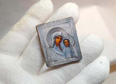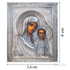 Miniatura di antica Icona Russa completamente realizzata a mano, raffigurante Madonna con Bambino.