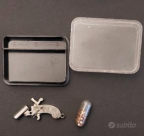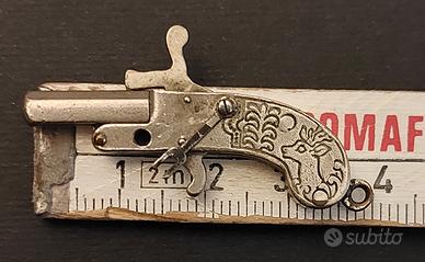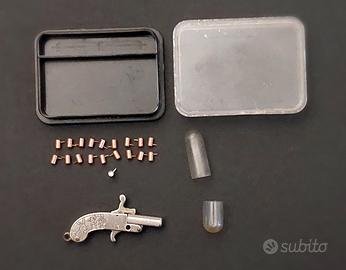 modellino in miniatura della pistola mod Berloque.Lunghezza cm.4.Il metallo è molto ben conservato, unico difetto manca vite di fissaggio braccetto come ben visibile in foto. È corredata di 19 cartucce inesplose e confezione originale.Da mè acquistata in negozio nuova, negli anni 60. SI PRECISA CHE NON È NATA PER SPARARE PROIETTILI MA PER EMETYERE FORTI BÒTTI