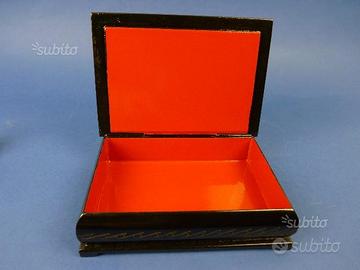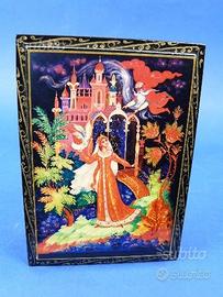 Piacevole scatola rettangolare con miniatura sul coperchio raffigurante Ludmilla nel bosco con castello sullo sfondo e mago.