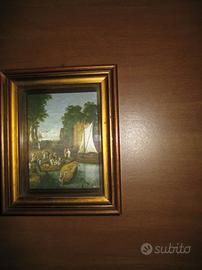Miniatura stampa antica del 900 oggetto molto bello raffigurante scena rurale con alberi laghetto e barche