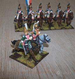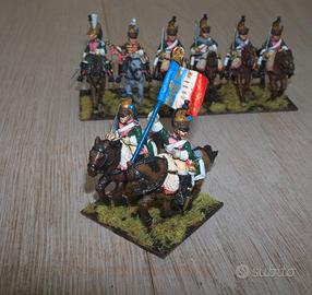 Otto miniature Wargames Foundry 28 mm rappresentanti il 13° o 15° reggimento di Dragoni francesi del periodo napoleonico. Ufficiale, trombetta, sott'ufficiale con bandiera e 5 dragoni, nella divisa introdotta nel 1812 (tranne una miniatura che veste la divisa precedente). Sono incollati, a due a due, su base di cartone 4x4 cm. La bandiera non è incollata in mano all'alfiere per evitare danni durante il trasporto. Dipinti con colori acrilici e protetti con fissativo. Usati ma in ottimo stato.