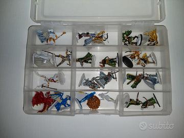 Vendo set miniature fantasy, comprendenti personaggi vari, in un contenitore di plastica.