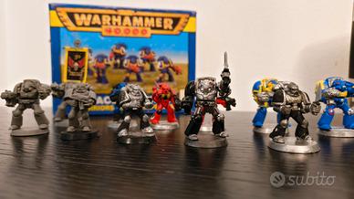 Collezione di 32 miniature di Warhammer 40.000: 5 Chaos Space Marine 5 Space Marine 10 Terminators 12 Xenos Alcuni già dipinti, altri ancora da dipingere, con due confezioni originali.