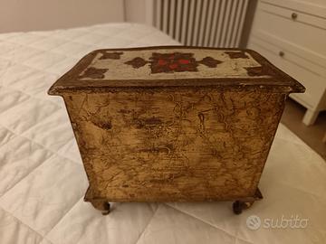 Deliziosa miniatura di cassettiera in legno, *realizzata artigianalmente* in stile fiorentino, con finitura dorata e motivi dipinti a mano. Dotata di tre cassetti funzionanti, è perfetta come decorazione retrò, portagioie o complemento d’arredo shabby chic.