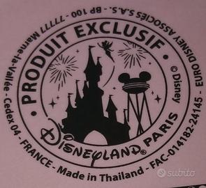 Sul fondo è presente il logo ufficiale di un prodotto esclusivo di DISNEYLAND PARIS. Al centro del marchio, in silhouette, il simbolo iconico del parco: Le Chateau de la Belle au Bois Dormant con superiormente la sagoma di Trilli in volo.