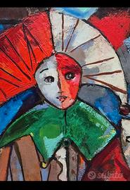 Questa sua magnifica opera d’arte rappresenta il gioco delle identità e delle emozioni attraverso il simbolismo delle maschere, della teatralità e del colore, evocando l’eterno dilemma tra apparenza e la vera essenza dell’essere umano.