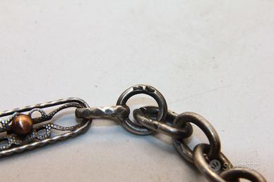 Questa mirabile catena da orologio della fine del 1800 rappresenta un raffinato esempio di alta artigianalità d'epoca, caratterizzata da un'elegante alternanza tra argento e preziosi dettagli in oro vermeil. La struttura si distingue per una lavorazione a maglie traforate di squisita fattura, arricchite da piccoli elementi sferici e ovoidali che donano dinamismo e un ricercato contrasto cromatico all'intero gioiello. Con una lunghezza complessiva di 37,5 cm e un peso di 9,8 grammi, l'oggetto conserva ancora i punzoni originali sulla maglia di raccordo, a testimonianza della sua autenticità e del valore storico. La chiusura a moschettone e il terminale a gancio, tipici dello stile dell'epoca, completano questo accessorio da collezione, rendendolo perfetto per chi cerca un pezzo d'antiquariato dal fascino intramontabile e dalla bellezza discreta.