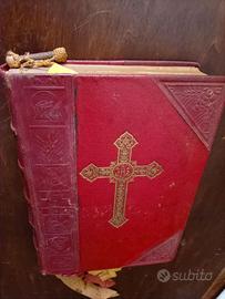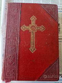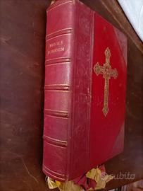 Missale Romanum, Typis Joannis Daverio, 1945. Testo in latino. Edizione pregiata. 26 cm x 18 cm, spessore 6 cm. 6 lacci segnalibro colorati in stoffa a nastro e 10 rossi a margine.