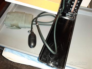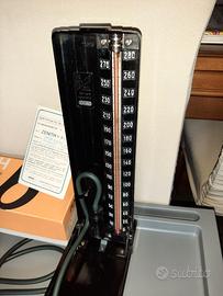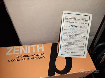 Sfigmomanometro a colonna di mercurio di marca Zenith, dispositivo medico vintage utilizzato per la misurazione manuale della pressione arteriosa. Include la colonna graduata in vetro, il bracciale in tessuto, la peretta in gomma per il gonfiaggio e la valvola di rilascio. È corredato dalla sua scatola originale e dal certificato di garanzia.