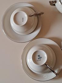 ELEGANTE SERVIZIO DI 4 TAZZE DA TE' CON PIATTINI + ZUCCHERIERA + LATTIERA FIRMATO MITTERTEICH BAVARIA STILE FUTURISMO IN PORCELLANA BIANCA - AVORIO. IMANICI, I BECCUCCI, LA RIGA A META' TAZZA E I PROFILI DEI PIATTINI SONO DECORATI IN ARGENTO. ASSENTE LA TEIERA.TUTTI I PEZZI HANNO IMPRESSI SUL FONDO IL MARCHIO BAVARIA E DIVERSI NUMERI, COME IN FOTO (125 EW, IN GENERE, SPESSO LA SIGLA M) LE TAZZE SONO ALTE 4,5 CM, HANNO DIAMETRO SUPERIORE DI 10 CM CIRCA + IL MANICO, I PIATTINI HANNO DIAMETRO DI CIRCA 14 CM. IN BUONE CONDIZIONI