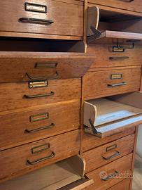 • Cassetti: Dotato di numerosi cassetti (18) con maniglie e porta-etichette in metallo (alcuni da sistemare o lucidare). Gli scomparti presentano dei piani estraibili, tipici dei mobili da archivio tecnico o da merceria.