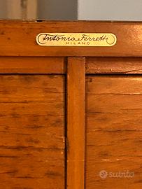 Vendo un raro e affascinante mobile d'archivio/cassettiera in legno massello di manifattura storica, riportante l'etichetta originale "Antonio Ferretti Milano". Questo mobile non è solo un pezzo d'arredamento funzionale, ma un vero e proprio pezzo di storia del design milanese.