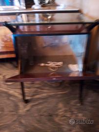 mobile bar con rotelle degli anni 50-60 in legno e altri materiali con rivestimento interno di piccoli specchi