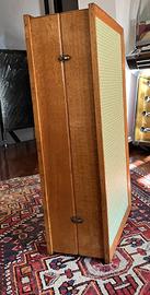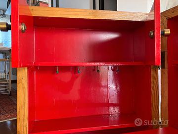 Mobile vintage per le bambole in legno, anni 60, rifoderato con carta adesiva, non toccato all'interno. Misure: larghezza 44 cm, altezza 83 cm, profondità 24 cm. Struttura solida ed integra, in buono stato estetico.
