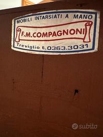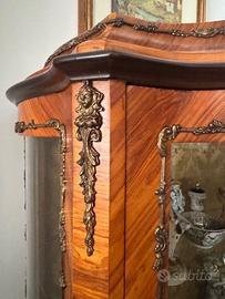 Mobile Vetrina cristalliera in legno bois de roses, con bronzi d'epoca e dipinti su ogni lato. Ha sul davanti serratura con chiave, all’interno tre ripiani, di cui n. 2 in vetro sagomati come la struttura ed il terzo ripiano foderato in tessuto broccato oro come su tutta la parete retro. Sotto ha un vano interno molto capiente e profondo, sagomato come il mobile. Misure: largh. cm. 82 – prof. cm. 52 – alt. cm. 163. E’ un cristalliera in ottime condizioni, i due vetri interni hanno alcuni segni/graffi dovuti all’appoggio degli oggetti- suppellettili, acquistata primi anni 1970 a Treviglio Mobilieri FM Compagnoni - Mobili intarsiati a mano, l'etichetta è sul retro del mobile. Ritiro a Bologna