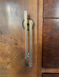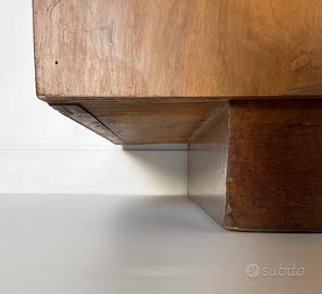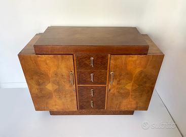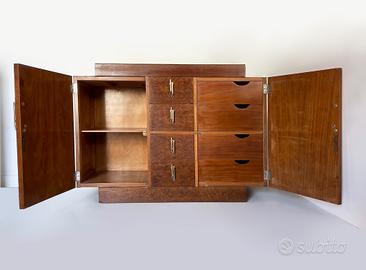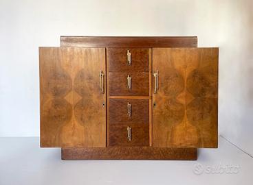 Elegante mobile credenza/cassettiera vintage Mid-century in radica, caratterizzato da una raffinata venatura speculare e dettagli in ottone originali. Linee pulite e design senza tempo lo rendono perfetto per ambienti classici o contemporanei. Dotato di ampio spazio contenitivo con ante laterali e ampi cassetti nascosti da anta e delicate maniglie in ottone con dettaglio in madreperla, unisce estetica e funzionalità. Dimensioni: L 132 x P 52 x H 95 cm Epoca: 1950 Provenienza: Italia