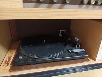 Mobiletto vintage Grundig contenente un sistema radio e giradischi. Tipo: Mobile audio d'epoca anni 60 Materiale: Legno impiallacciato. Funzioni: Include un ricevitore radio e un giradischi nascosto sotto il pannello centrale.