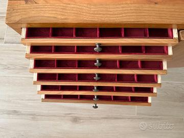 1 cassettino alto 2 cm senza divisioni rivestito in velluto colore cremisi.