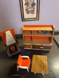 Raro set di mobili per casa delle bambole degli anni '60, composto da: un mobile "da soggiorno" con 3 ante e ripiani porta libri (legno e plastica finta per le ante), un tavolo abbinato (legno e plastica per la base), una poltrona materiale plastico rigido), tavolino, tutto originale