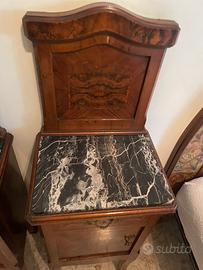 In vendita un set di mobili anni 30 in stile antico,composto da coppia di comodini,comò e toletta in radica intarsiata,tutti con base in marmo pregiato nero a venature.