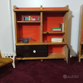Libreria, caminetto e poltroncine per salottino, soggiorno per casa delle bambole, Barbie o simil bambole in legno e tessuto.