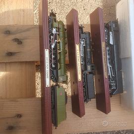 Vendo modellini statici di locomotive a vapore da collezione, curati nei dettagli e montati su base in legno con targhetta identificativa.