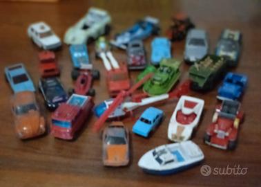 Assortimento di modellini di auto e veicoli giocattolo in metallo. Vari tipi di veicoli, tra cui auto da corsa, camion, veicoli da costruzione e auto d'epoca