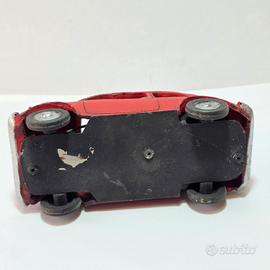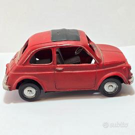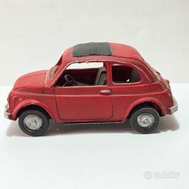 Modellino auto Fiat 500 in metallo verniciato rosso. Si trova in discreto stato di conservazione, presenta segni di usura come vernice persa in qualche punto, graffi e la vernice nel fondo si sta staccando. Vetri assenti. Vedere foto per altre informazioni. Misure: 14,5 x 6,5 x h 7 cm circa