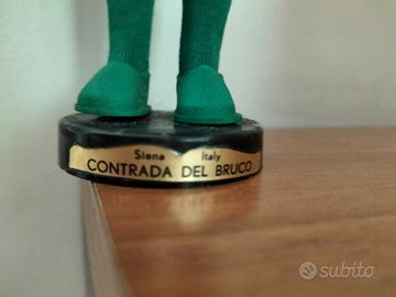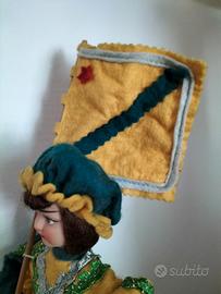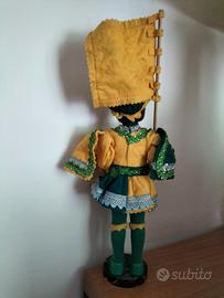 Modellino bambolina vintage originale Palio di Siena CONTRADA DEL BRUCO in pannolenci su supporto tondo di cm 5 diametro e cm 1 altezza recante scritta originale Siena Italy CONTRADA DEL BRUCO, altezza cm 25 alla bandiera cm 21 al cappello, in perfette condizioni X COLLEZIONISTI